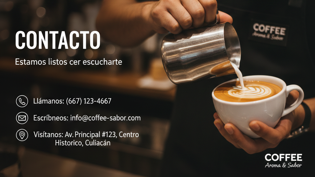 “En COFFEE Aroma & Sabor, nos encanta escucharte. Ya sea que quieras reservar una mesa para co-working, preguntar por nuestros pasteles del día o simplemente saludarnos, estamos aquí para ti.”