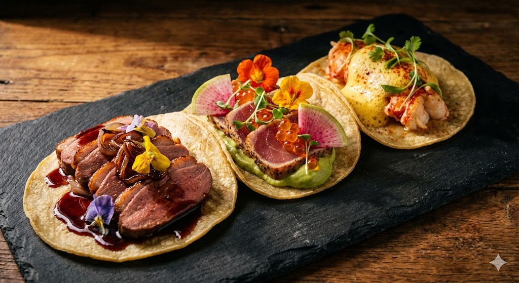 La taquería gourmet eleva el humilde taco a una experiencia culinaria de alta gama. Aquí, la tortilla no es solo un vehículo, sino una base artesanal, a menudo hecha a mano con maíces criollos de colores. Los ingredientes protagonistas huyen de lo convencional: piensa en pato confitado con salsa de frutos rojos, cortes Wagyu, o mariscos frescos con emulsiones complejas. La presentación es meticulosa, casi artística, diseñada para ser fotografiada antes de ser devorada. El ambiente es sofisticado y el servicio atento. No se trata solo de saciar el hambre, sino de sorprender al paladar con texturas y contrastes inesperados, justificando un ticket promedio más alto.