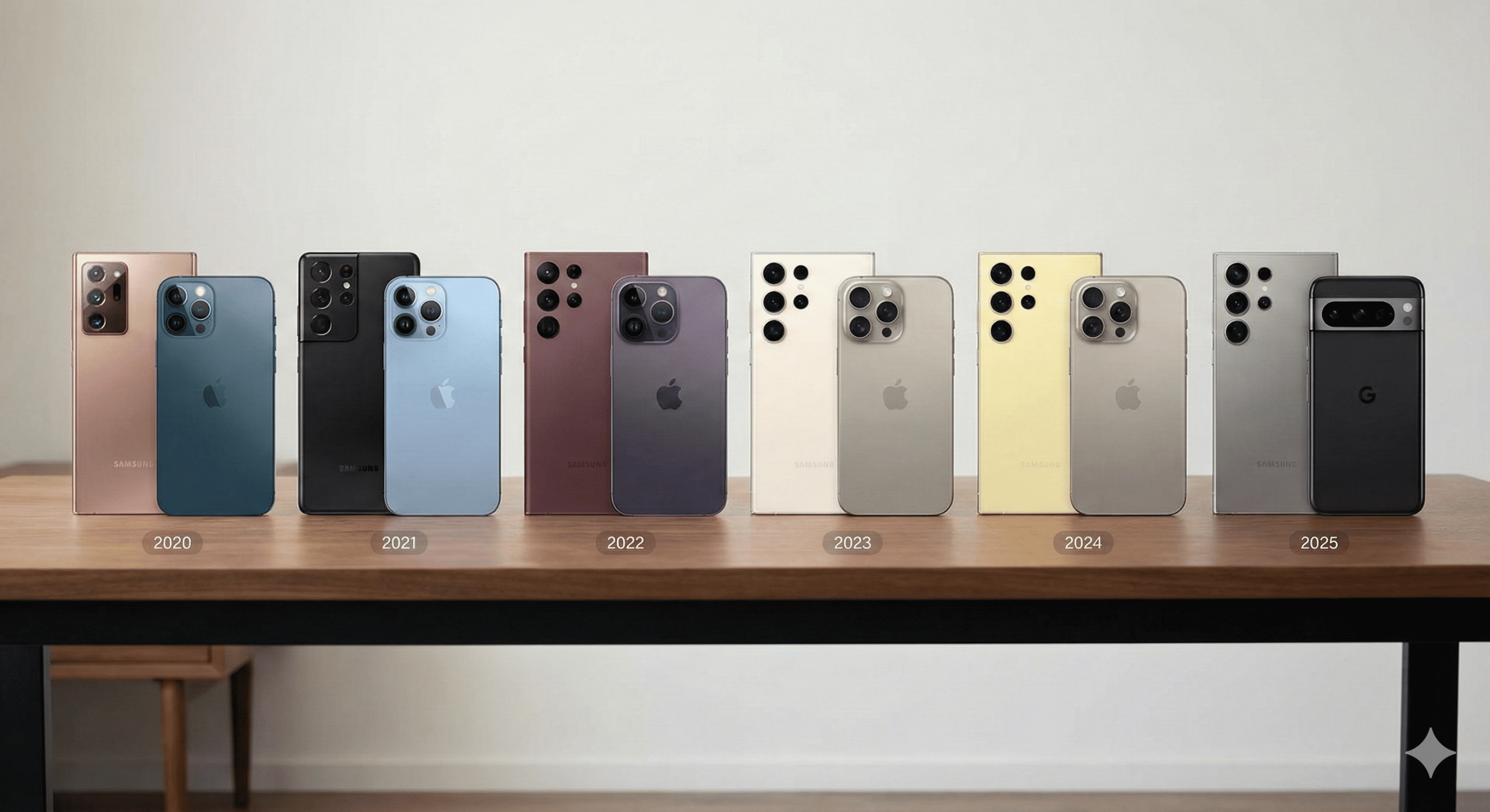 Si colocamos sobre una mesa los buques insignia de Samsung, Apple y Google desde 2020 hasta los lanzamientos más recientes de 2025, la imagen resultante es fascinante y, a la vez, reveladora. Vemos una evolución en los materiales —del cristal brillante al mate, y luego al titanio— y módulos de cámara que han crecido como organismos vivos devorando la parte trasera de los dispositivos. Pero más allá de la estética, esta línea de tiempo plantea una pregunta incómoda para la industria y crucial para tu bolsillo: ¿Ha muerto la necesidad de la actualización bianual?