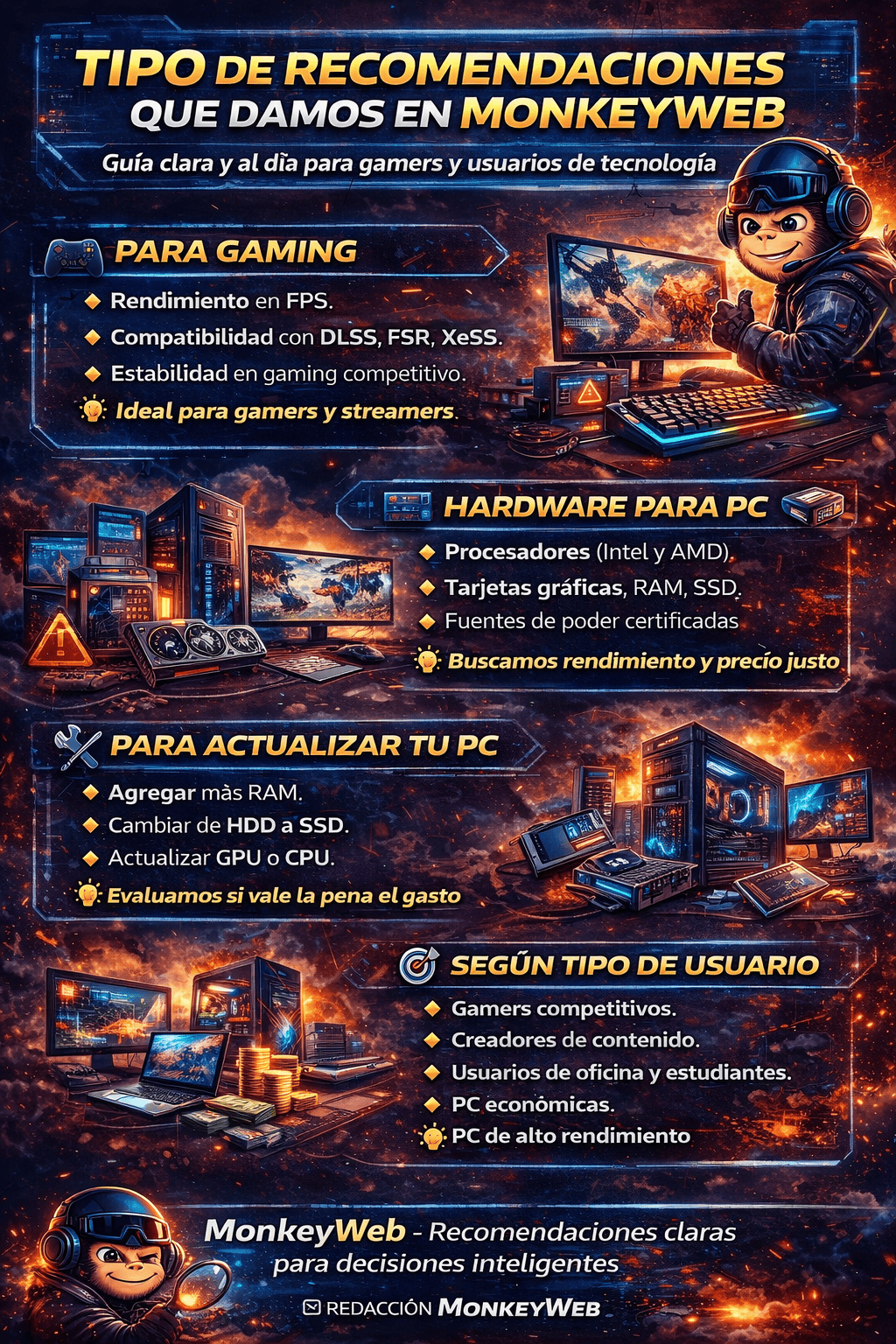En MonkeyWeb ofrecemos recomendaciones basadas en tendencias actuales, rendimiento real y relación calidad-precio, pensadas tanto para gamers como para usuarios de tecnología en general.